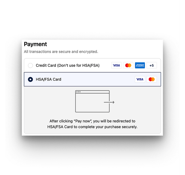 In the checkout, choose the "HSA/FSA" payment method, then simply enter your HSA or FSA card like a normal credit card. No reimbursement steps needed.