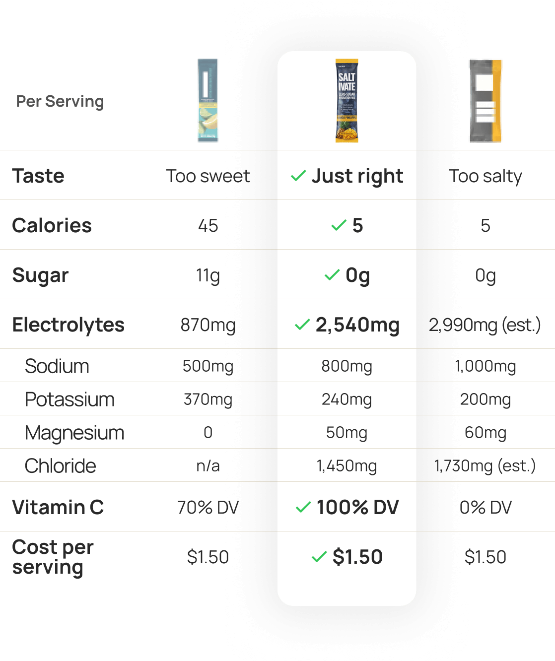Saltivate: 5 Calories, 0g Sugar, 2,470 mg Electrolytes (800mg Sodium, 200mg Potassium, 50mg Magnesium, 1,420mg Chloride)